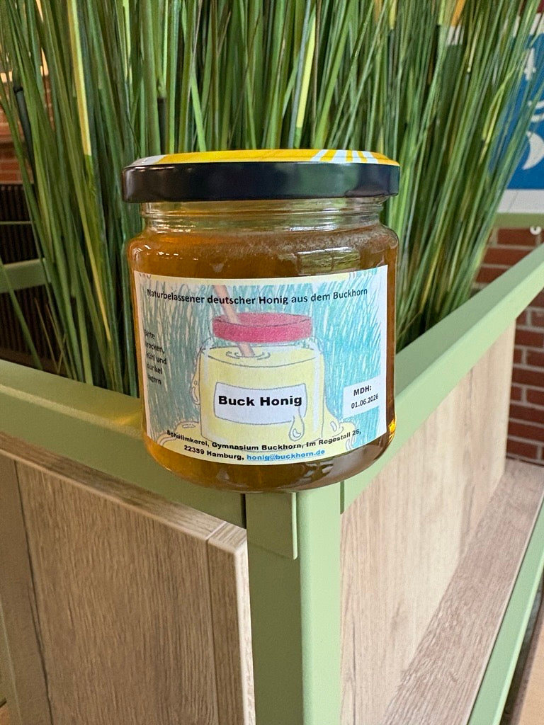 Der ,,Buck-Honig" ist ein regionaler naturbelassener deutscher Honig aus Hamburg, hergestellt vom Gymnasium Buckhorn. Das handgezeichnete Etikett unterstreicht die liebevolle und nachhaltige Produktion. Perfekt für Genießer hochwertiger, lokaler Lebensmittel.